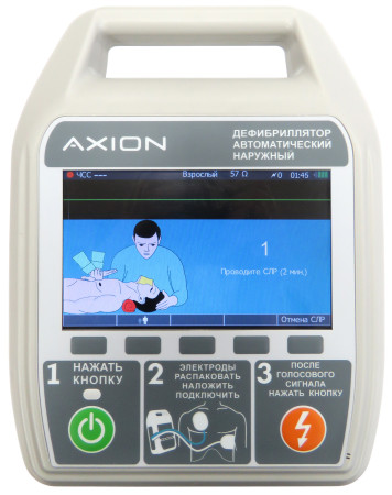 Автоматический наружный дефибриллятор ДА‑Н-02 Аксион помогает спасти жизнь при внезапной остановке сердца. Устройство автоматически анализирует сердечный ритм, при необходимости подаёт бифазный усечённый экспоненциальный импульс через электроды (трансторакально) и даёт оператору голосовые и визуальные инструкции по проведению сердечно‑лёгочной реанимации (СЛР). Предназначен для дефибрилляции при фибрилляции желудочков и желудочковой тахикардии без пульса.
