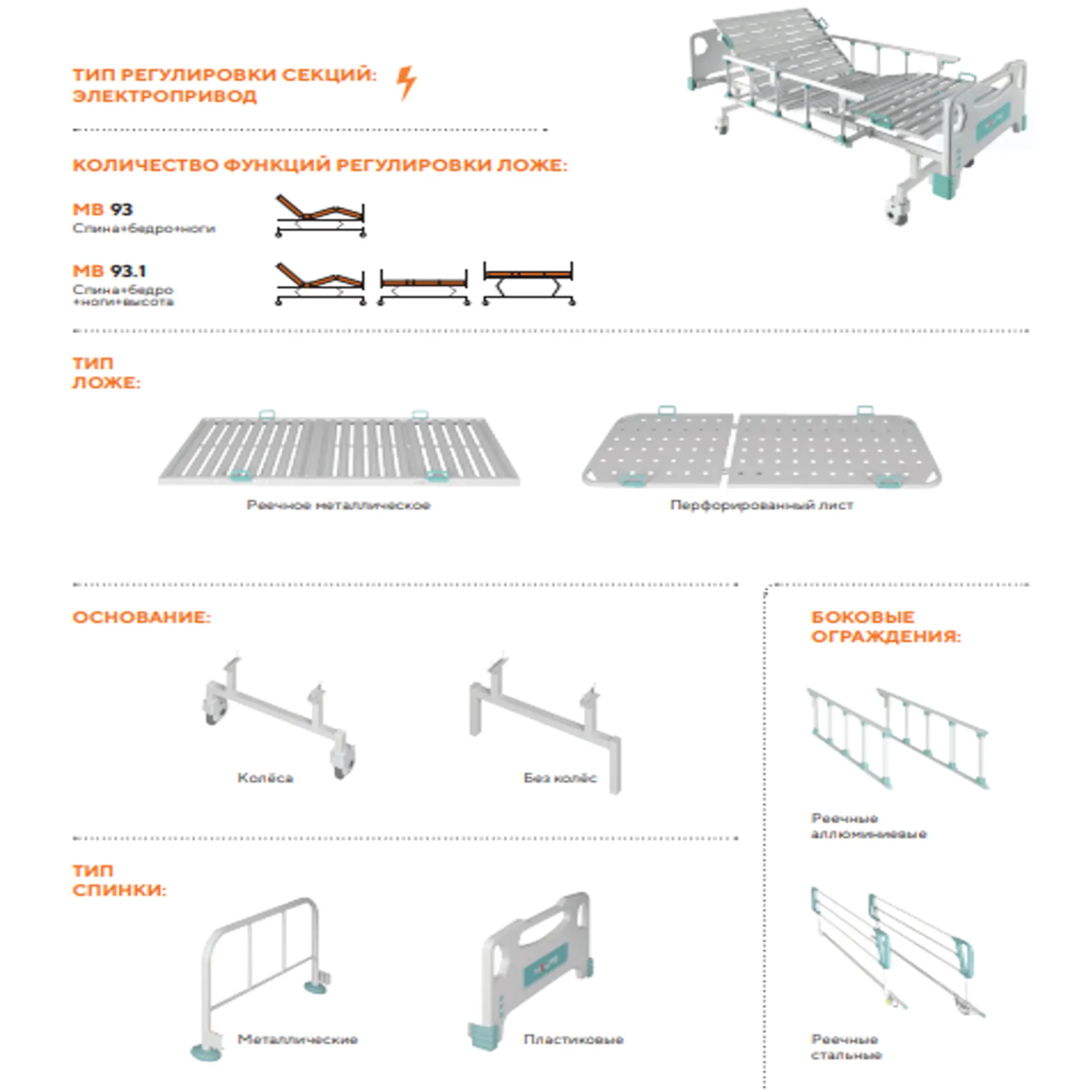 - четырехсекционное металлическое реечное ложе регулируется с помощью электроприводов, каркас изготовлен из профильной трубы прямоугольного сечения, покрыта эпоксидно-порошковой краской;