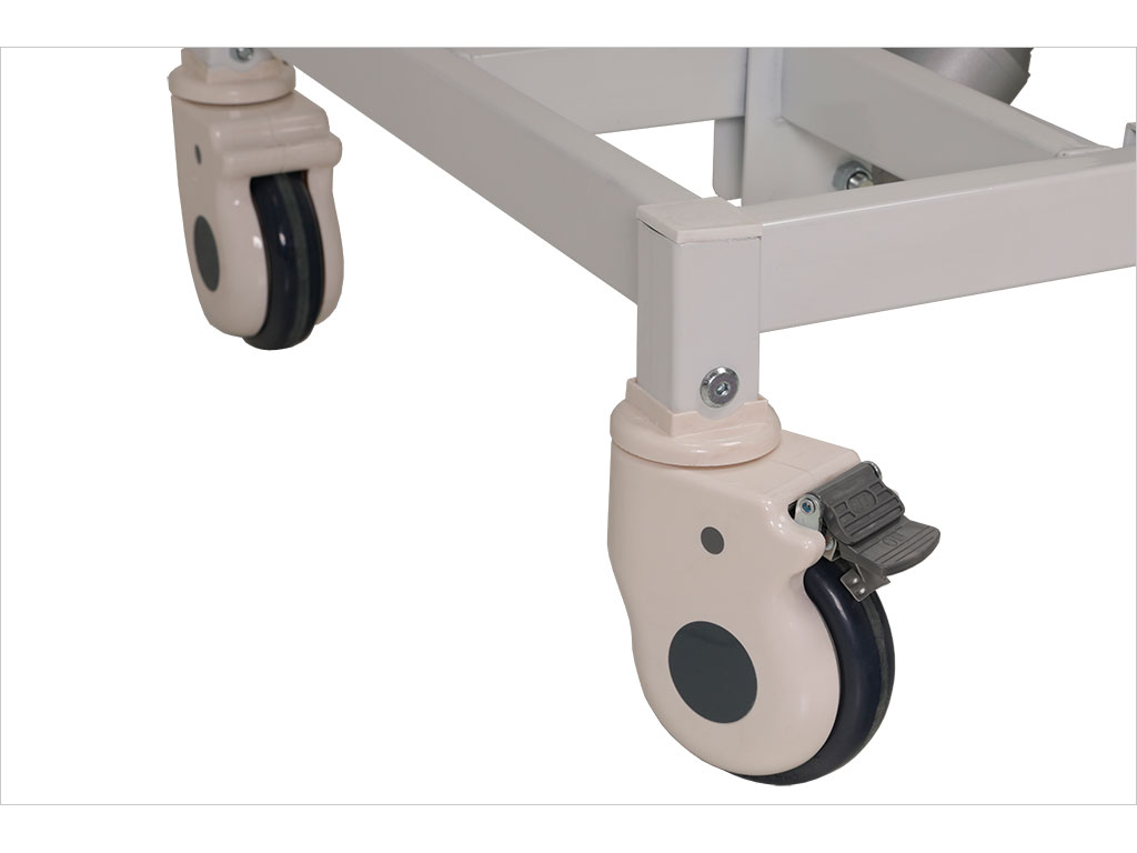- установлена на 4 самоориентирующиеся колеса, 2 колеса с тормозным устройством, покрытие колес серая резина (не оставляющая следов на полу);