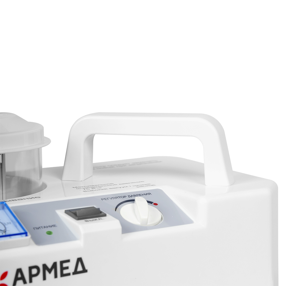 Педиатрический отсасыватель Армед 7Е-В имеет небольшие габариты, поэтому его можно переносить в помещении за удобную ручку. Для включения и управления прибором предназначена одна кнопка и механический регулятор. В комплекте с оборудованием предусмотрен специальный детский катетер.