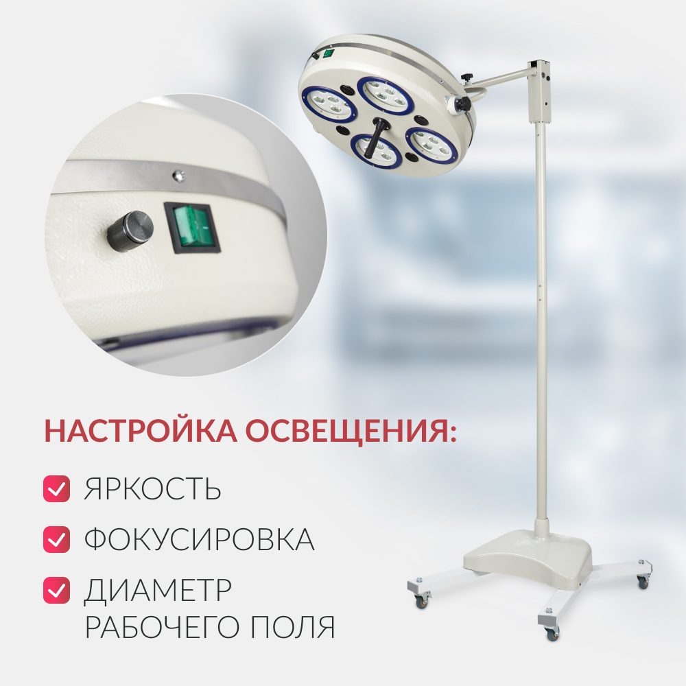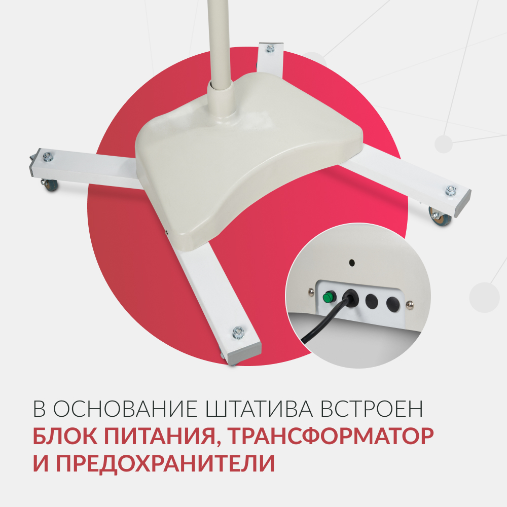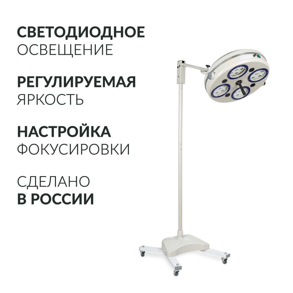 Передвижной светодиодный светильник российского производства, используемый при проведении перевязок, осмотров и несложных операций. Модель имеет продуманную конструкцию и удобную настройку параметров. Светодиоды обеспечивают яркое равномерное освещение, низкое энергопотребление и длительный срок службы прибора.